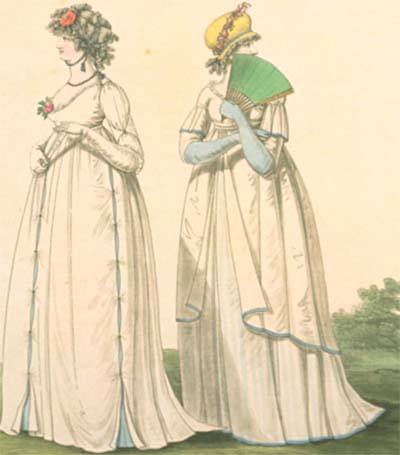 186, morning dress: “Petticoat of striped muslin, trimmed round the neck with lace; short sleeves; the epaulettes and the bottom of the robe trimmed with blue silk riband.”