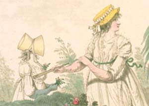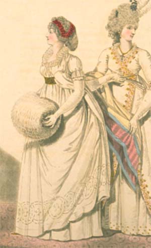 181: “… melon-ribbed hat of lilac and green silk, with a very large crown, trimmed round with a wreath and a bouquet in the front … Petticoat of white muslin; robe of the same, short full sleeves, trimmed with lace, and tied in the middle with an embroidered lilac riband; the whole bordered with an embroidery of flowers, and tied in the front with lilac riband.”