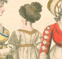 April 1798, fig. 176, afternoon dress. “Head-dress à l’antique. … Round dress of white muslin, the body in small plaits, with a herringbone back; drawn full sleeves; the whole trimmed with Roman-pattern gold lace.”