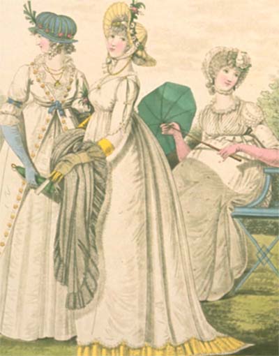 189: “Round gown of cambric muslin, the train in Vandyke scollops; short close sleeves. White muslin cloak trimmed with lace, and tied to the waist with a green riband.”