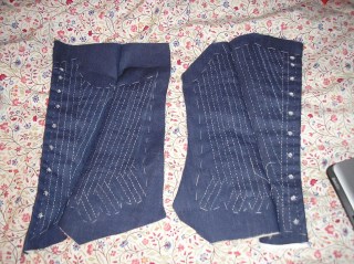In September 2009, I finally let myself order the stays kit from Silly Sisters in blue linen. It took me months and months – it’s hard to commit to sewing miles of boning channels when you have papers to write – but I think around the September of 2010 I had them basically finished (minus the lining and maybe a row or two of horizontal boning across the sides). I used the 1730s-1740s pattern in Corsets & Crinolines, as I really like that period and plan to make a gown from it for my own nefarious purposes, and the instruction from Cherry Dawson’s stays workshop (now offline).