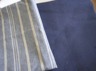 The bundle, as it came from Silly Sisters. Dark indigo linen, blue and white striped linen for the lining, white linen canvas, and leather strips for the binding.