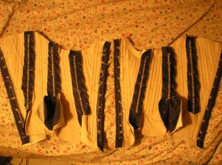 Very yellow picture of the inside of the stays, before I cut out the tabs. The one thing I don’t like about this pattern is the way the front tabs point back and the back ones point front – it makes them overlap at the side and it’s just difficult to deal with and looks bad. Next time I make stays, the tabs are going to slant less.