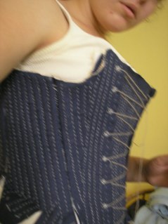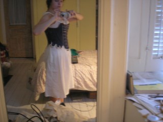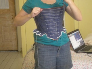 Over an inaccurate shift, just to show it against the white. Still not getting the whole tension thing, you can see that the stays aren’t laced as tightly as they were in earlier pictures. Some of that was also that I wasn’t pleased at the amount of flattening I was getting on my bust, which is what’s prompting me to think about putting in the horizontal boning indicated on the pattern that I’d ignored – that would make the stays stand out more at the top, right?