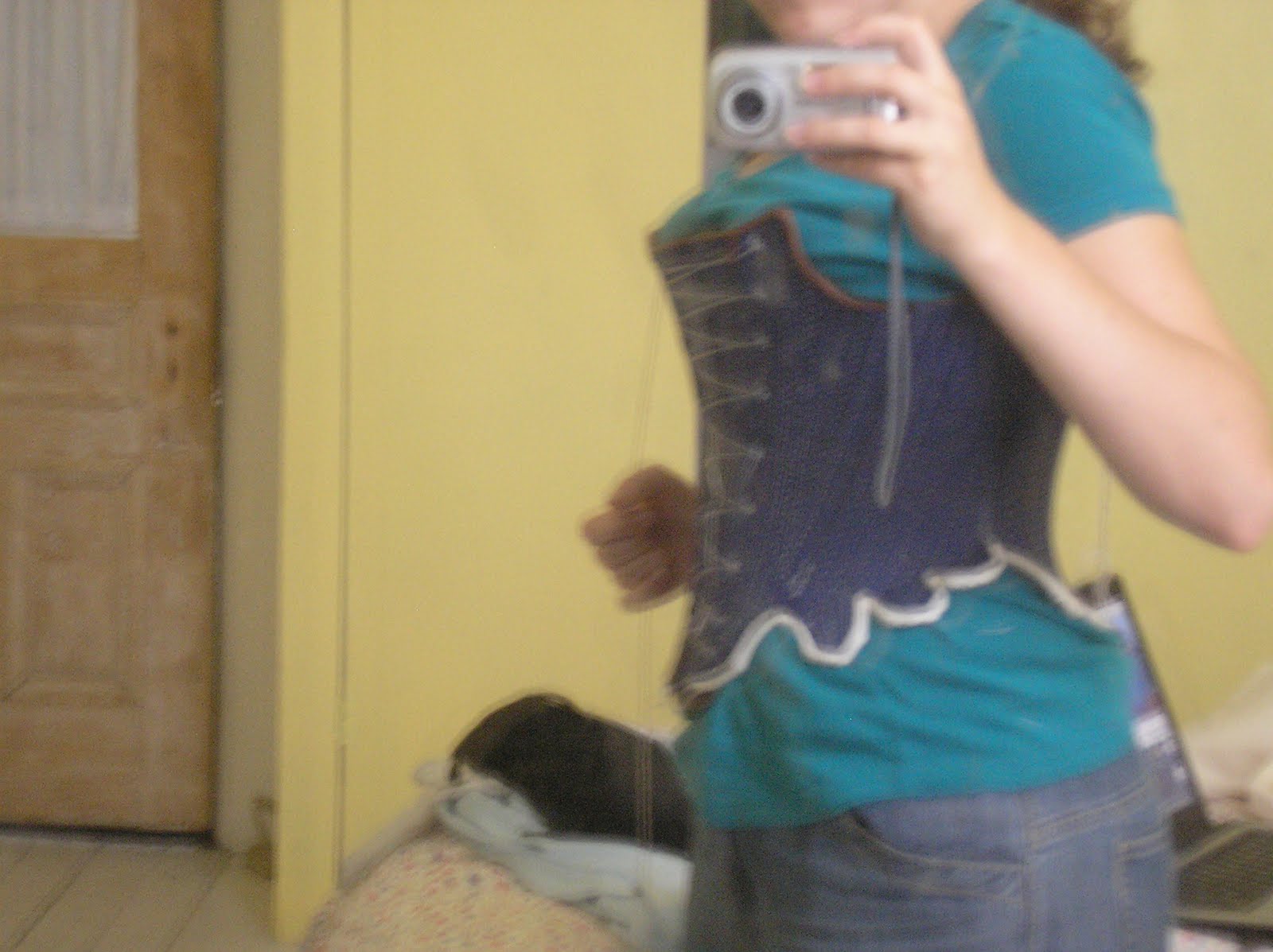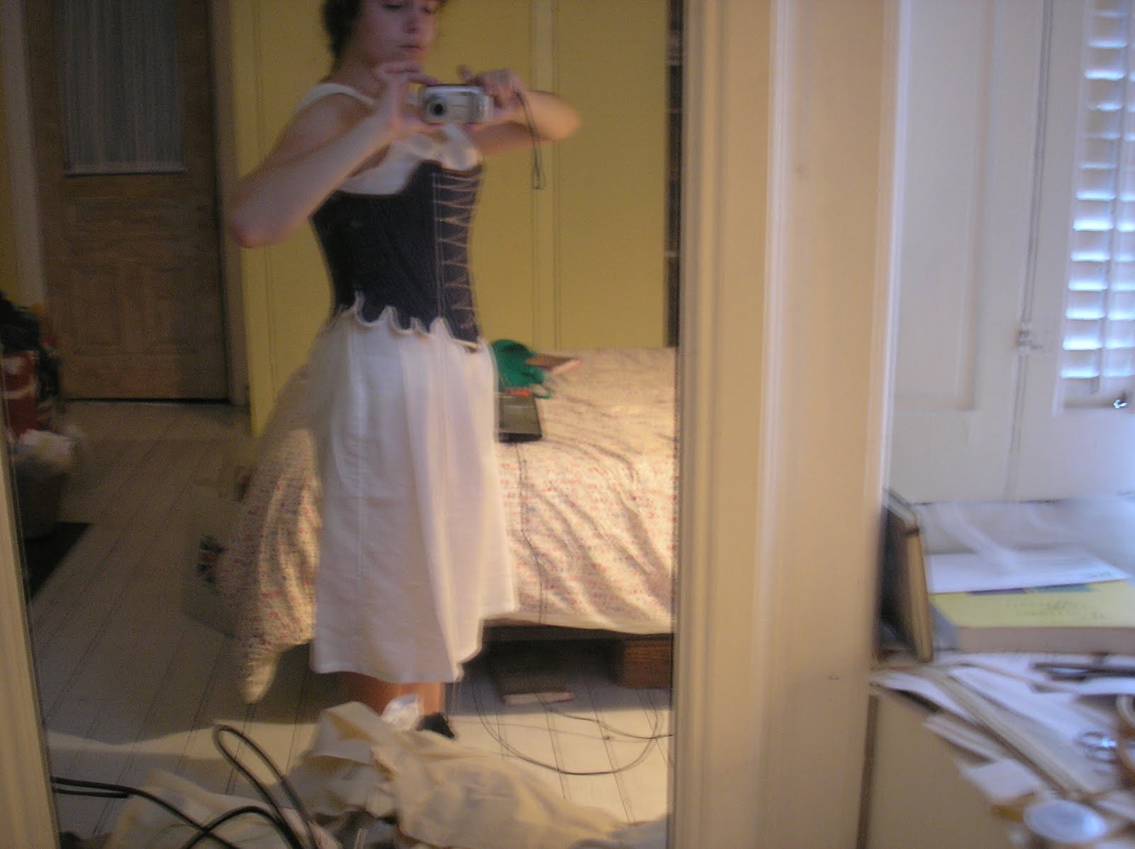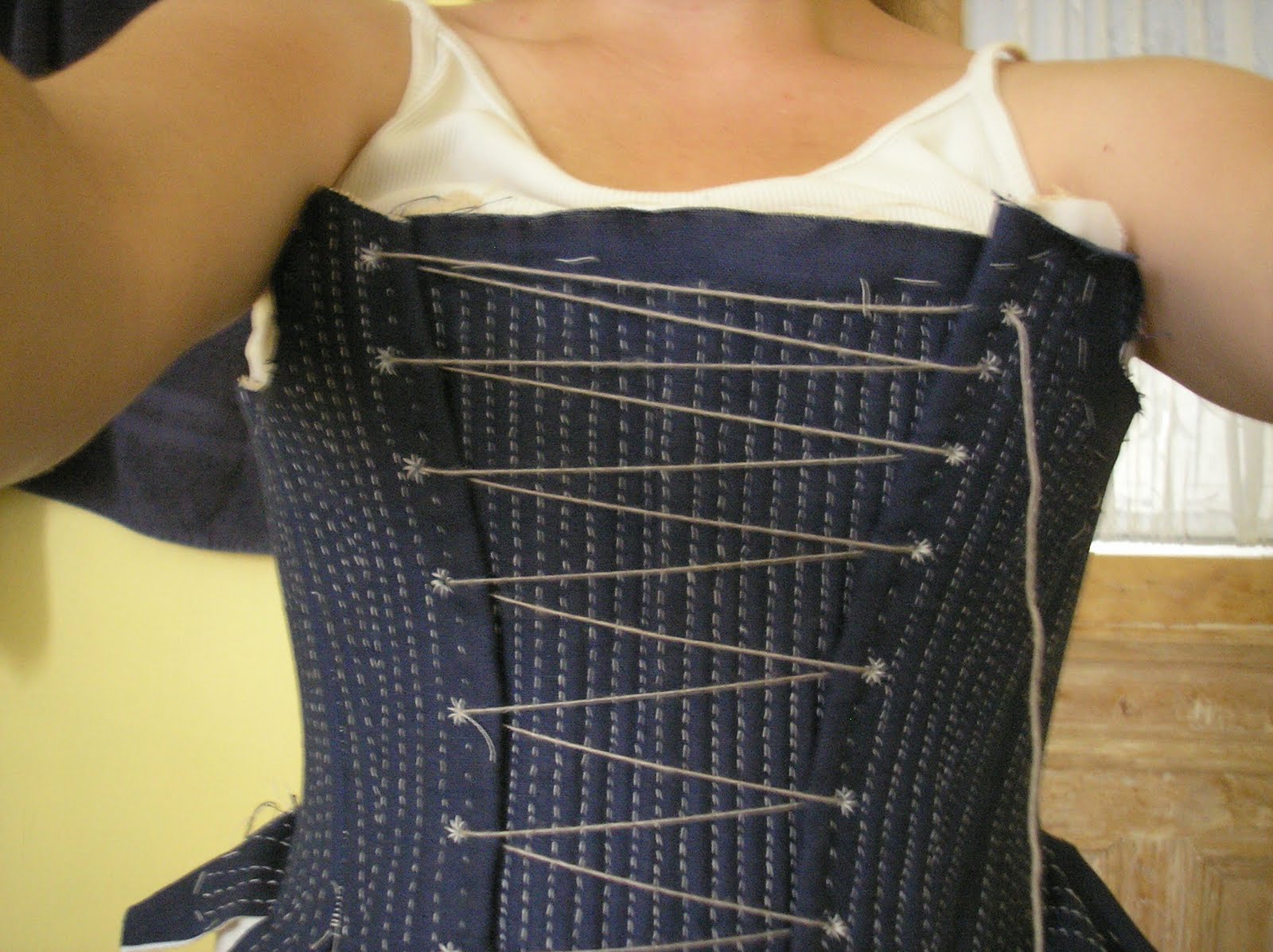 In September 2009, I finally let myself order the stays kit from Silly Sisters in blue linen. It took me months and months – it’s hard to commit to sewing miles of boning channels when you have papers to write – but I think around the September of 2010 I had them basically finished (minus the lining and maybe a row or two of horizontal boning across the sides). I used the 1730s-1740s pattern in Corsets & Crinolines, as I really like that period and plan to make a gown from it for my own nefarious purposes, and the instruction from Cherry Dawson’s stays workshop (now offline).