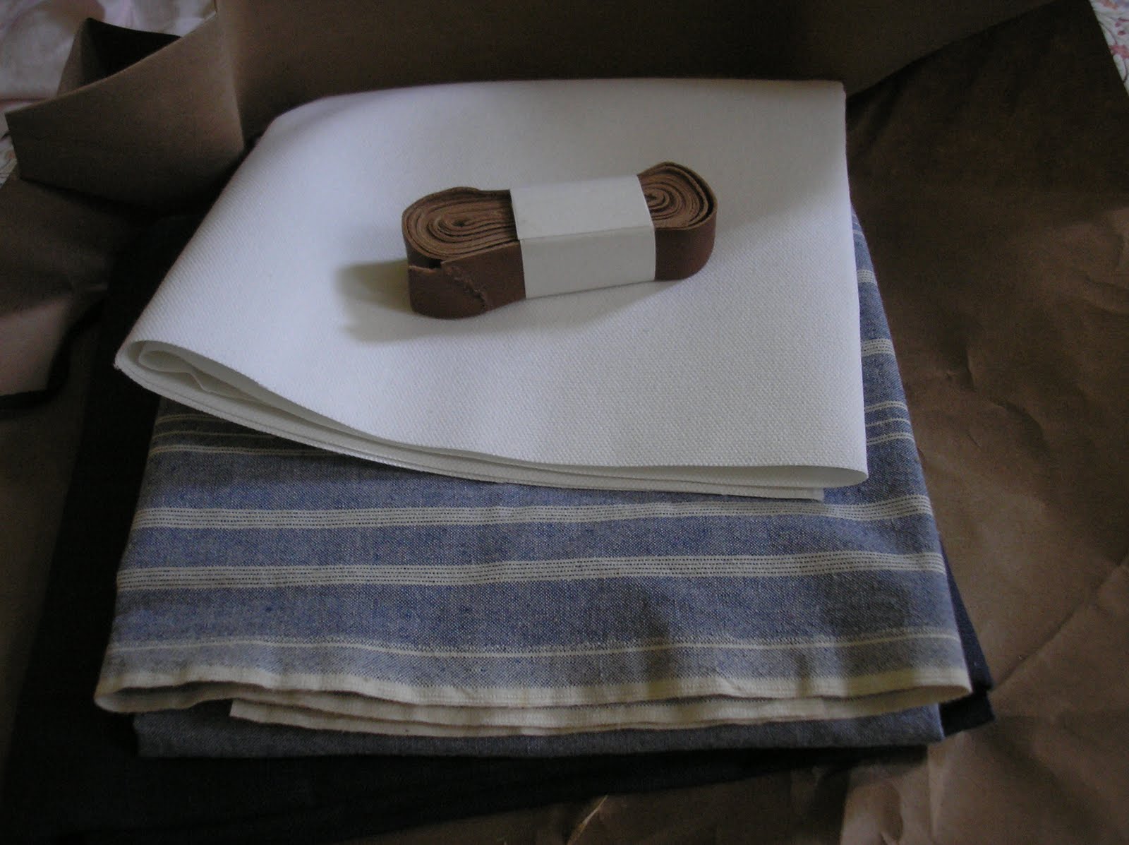 The bundle, as it came from Silly Sisters. Dark indigo linen, blue and white striped linen for the lining, white linen canvas, and leather strips for the binding.
