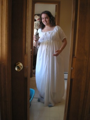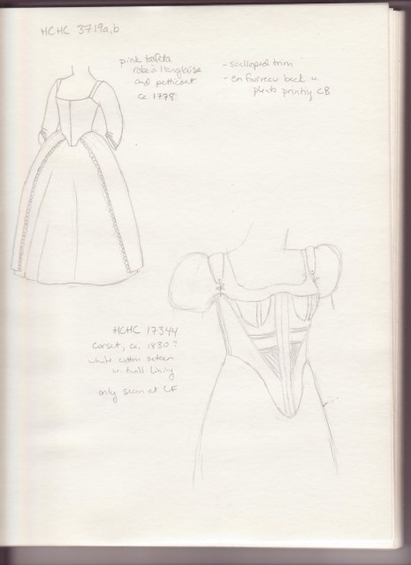 For some reason, I sketched out the pink taffeta gown and the interesting corset I examined yesterday. (I used Patterns of Fashion as a reference for the gown but still managed to make the figure too short in the leg … not sure how.) And I thought I’d post the pictures I took of my thesis project pre-ensleeving, in which I look pretty darn happy.