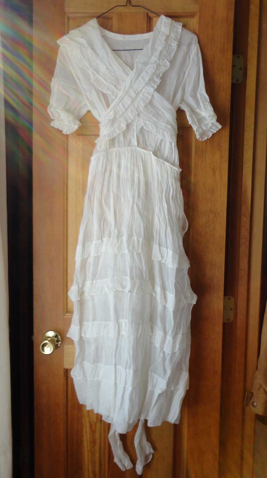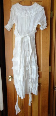 White cotton lingerie dress. V-neckline shaped by double-ruffled faux kerchief, of a length to cross in front, and tie in the back (or possibly to also cross in the back and tie in the front). Kimono sleeves are edged with two ruffles the same size as those on the kerchief. Bodice is evenly gathered and sewn to the upper and lower edges of a petersham waistband, which is on the outside of the bodice. Closes center back with snaps. Unshaped skirt, which is decorated with four deep tucks, is folded under and gathered to the waistband on the upper edge, outside. Worn by Ardis Burdick (b. 1902) at her high school graduation.