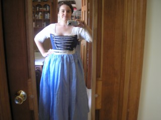 My petticoat is very simple, rectangles pleated to a length of twill tape. The only way I deviated from the standard method was to make it so both front and back were put on the same piece of tape, which ties over one hip. Somehow it managed to be too wide, so I’m going to have to take it in at some point.