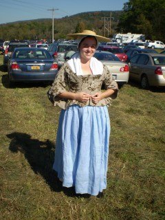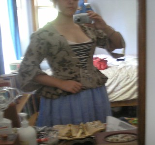 Made out of a heavy linen, probably meant for upholstery, and lined in unbleached muslin; I used both linen and cotton thread. Originally, I was using the C pattern on p.26 of Patterns of Fashion I (ca. 1760-70):* however, once I put it together I realized that it was far too short for me, and because the pieces are shaped with no waist seam, it would have been difficult to enlarge by piecing. So I put it away for a while and started over on jacket B (ca. 1735-40), though I kept C’s sleeves and cuffs, and I had the pattern draped on myself rather than just scaling up. I used the method shown in Costume Close-Up, where the outer fabric and one piece of the lining are sewn together, and then the other piece of the lining is lapped over the seam and sewn down. After this picture was taken, I made the stomacher and added in more eyelets so I could cross-lace the jacket closed, as spiral lacing made it crooked.
