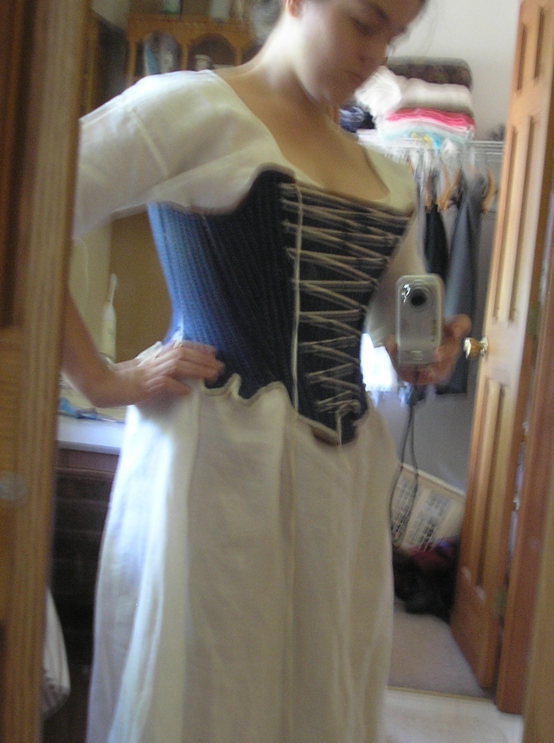 Made out of a heavy linen, probably meant for upholstery, and lined in unbleached muslin; I used both linen and cotton thread. Originally, I was using the C pattern on p.26 of Patterns of Fashion I (ca. 1760-70):* however, once I put it together I realized that it was far too short for me, and because the pieces are shaped with no waist seam, it would have been difficult to enlarge by piecing. So I put it away for a while and started over on jacket B (ca. 1735-40), though I kept C’s sleeves and cuffs, and I had the pattern draped on myself rather than just scaling up. I used the method shown in Costume Close-Up, where the outer fabric and one piece of the lining are sewn together, and then the other piece of the lining is lapped over the seam and sewn down. After this picture was taken, I made the stomacher and added in more eyelets so I could cross-lace the jacket closed, as spiral lacing made it crooked.