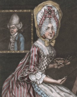 The painter’s stomacher looks like it’s printed with large, close-set polka dots, and it has a large cockade at the top. The stripes on her sleeves run down the arm, and the sleeve ends before the elbow (unlike the shift sleeves, which are full and end below the elbow). Her robings are trimmed with a very narrow, very tightly curved trim, and her kerchief and sprigged apron are both bordered with a gathered trim. The bottom of her apron isn’t visible in this detail, but it is fairly long.