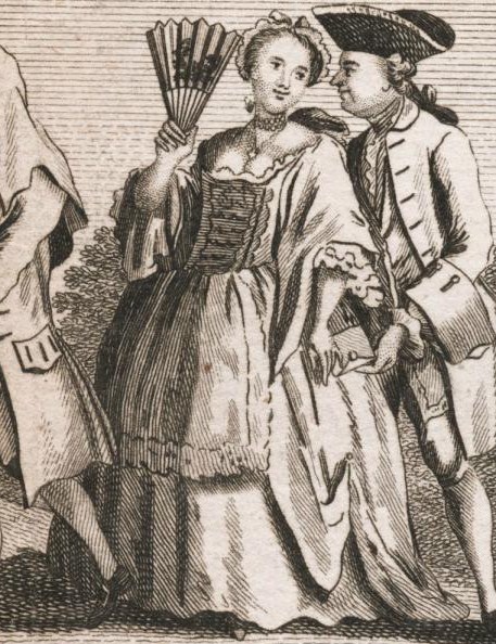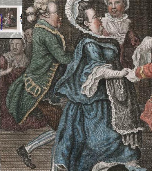 The seated woman in pink on the left has a gathered trim on her robings, and across the top of her stomacher; her petticoat is quite long. The dancing woman’s sacque* is rétroussée, probably through the pockets, and is still long. Her sleeves end above the elbow and have two self-fabric ruffles. Her apron, which has pocket slits, is about knee-length, semi-obscuring the trim on the front of her petticoat.