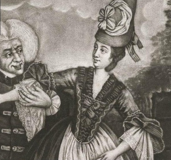 The woman on the right has a row of narrow, gathered trim on her robings, and an echelles stomacher like the one in “The Ladies Disaster”. Her sprigged apron (probably made of pre-embroidered fabric) is as long as her petticoat, which is ankle-length. There is a bow on her sleeve above the ruffles – there would be another, most likely, on the other arm if the artist had not accidentally neglected to draw it – and the crown of her hat is lushly circled with them as well. She is wearing a pendant on a black cord. The woman on the left has two fly-fringe-trimmed self-fabric ruffles on her sleeve, and a very narrow band of gathered trim above them. Her gown is pulled up through the pockets, above a flounced and trimmed petticoat. Her apron is plainer and shorter, cut below the knee. Her cap has an unshaped ruffle, rather than being round-eared, and her choker is a thin black ribbon. Both women have heeled shoes with buckles, and lace on the neckline and flounces of their shifts. The woman on the far left, inside the bagnio (possibly a servant), is dressed in an untrimmed dress and plain stomacher, and her sleeves are cuffed.