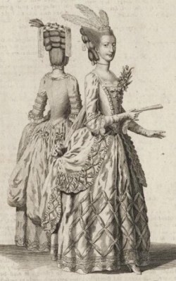 Both of these ladies are wearing rétroussée gowns; the one on the left is an anglaise
