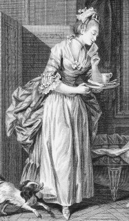 lower part of her robings and on her flared cuffs. The lady in the anglaise