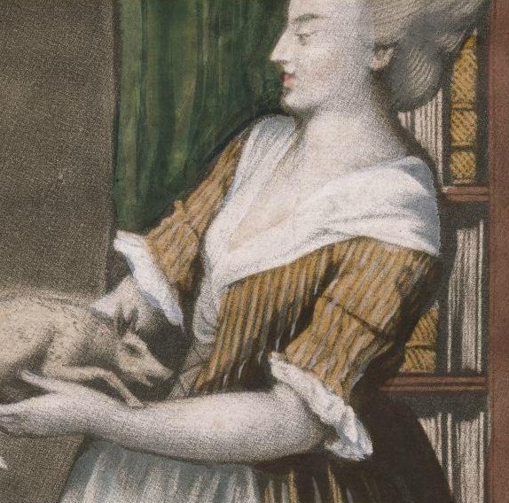 lower part of her robings and on her flared cuffs. The lady in the anglaise