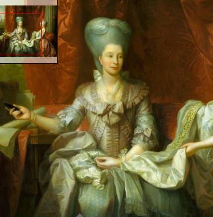 Both of these ladies are wearing rétroussée gowns; the one on the left is an anglaise