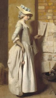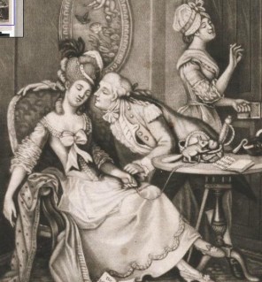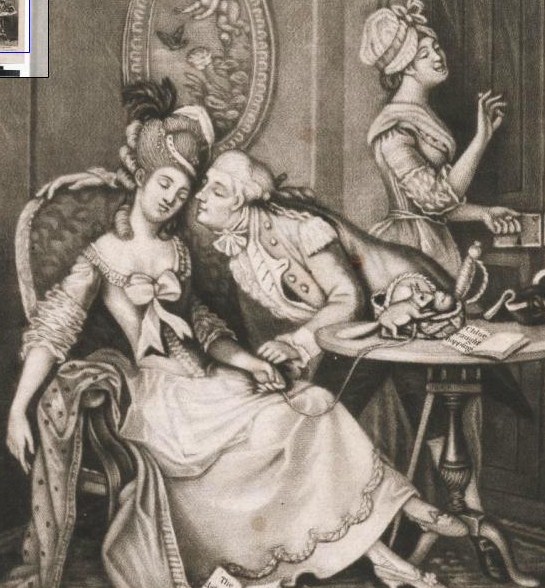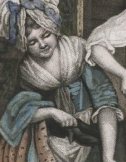 The young woman is dressed in a polonaise, trimmed along the cutaway front with a satin band, and on the sleeves with heavily ruched cuffs. The older woman is wearing the older style, with bows on the stomacher and sleeves, and self-fabric ruffles. The subtext is that the young woman has ideas above her station and is dressing in accordance with them (and has probably lost her virtue), while the older woman’s clothing is what someone of their class ought to be wearing in order to be respectable.