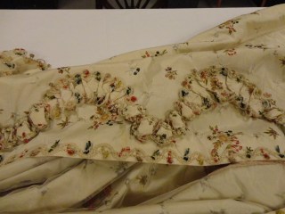 I’m especially interested in thoughts on dating – the information given with the ensemble when it was donated in 1915 says that it was worn by Anna Van Schaick at her wedding in 1775, but it simply doesn’t feel that late to me (hence the “ca. 1765” in the post title). Thoughts? A picture of the trim and fabric below.