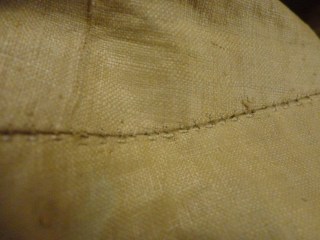 One last question. The side-back seam is definitely done with both pieces of linen and the back piece of the silk sewn together at the same time, and the front bodice piece lapped over the seam and sewn down with running stitches all the way through to the lining. I’m not quite sure what stitch was used in the first step, though. Here’s a picture I took (click to enlarge) – the running stitch next to the seam is from the lapped piece, and the smaller stitches are the ones confusing me. Hopefully someone else has used a technique that looks like this and can identify it?