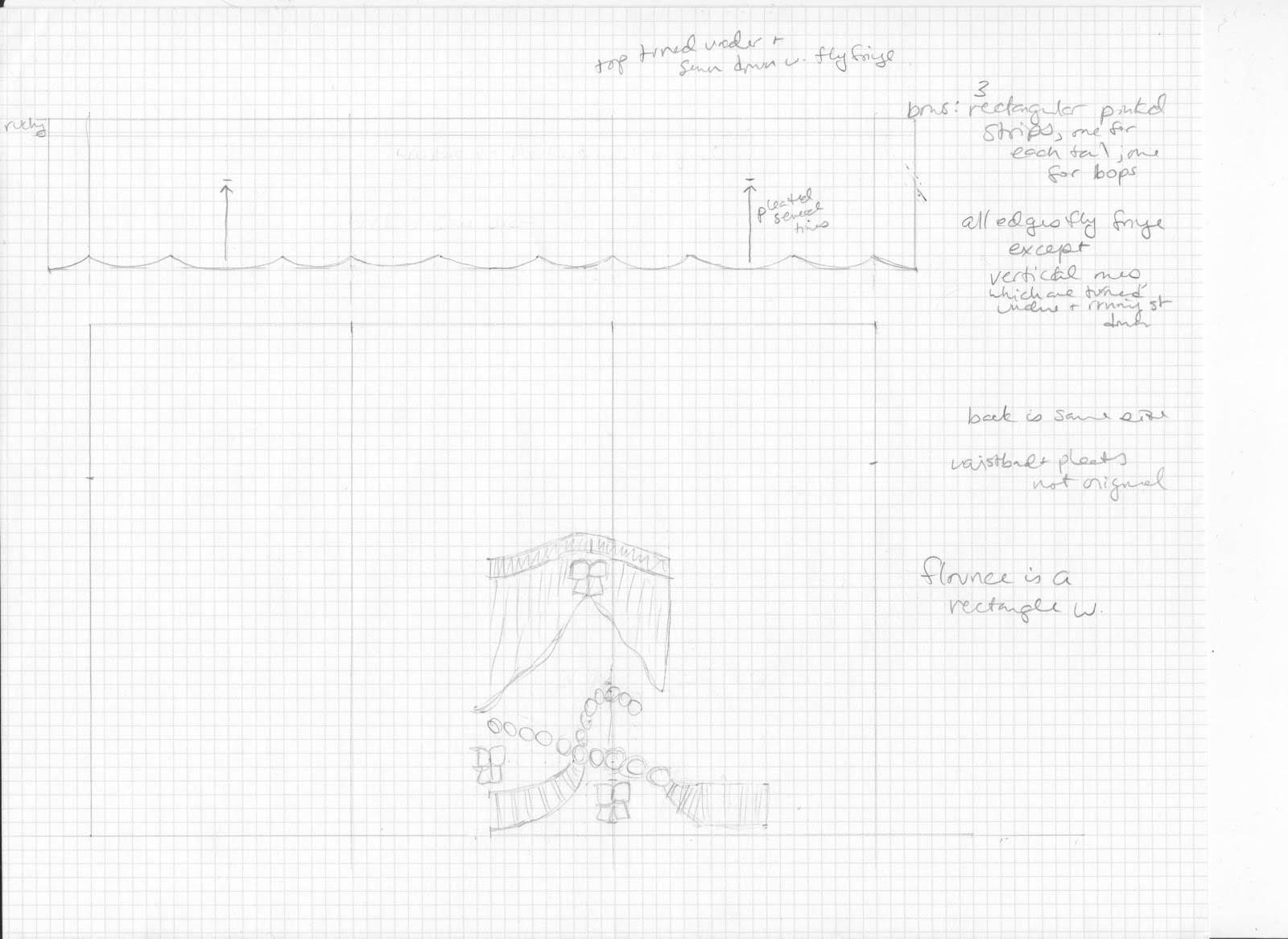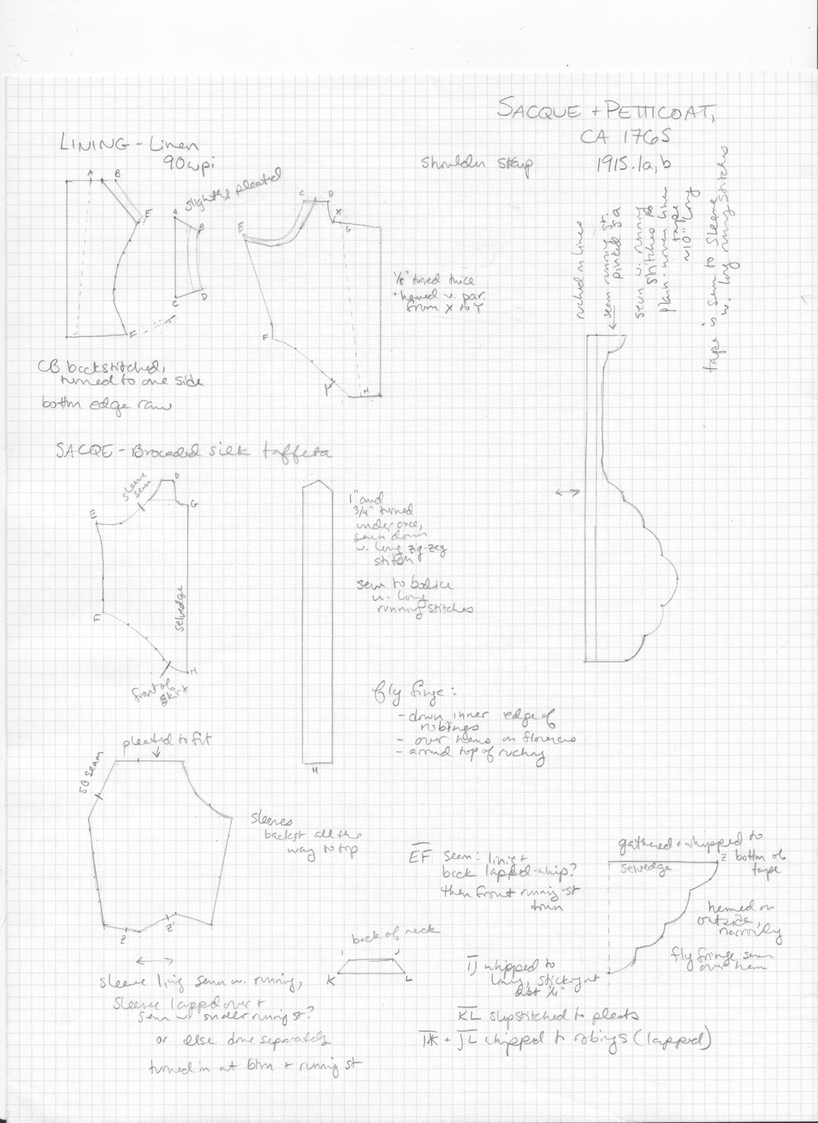 Dear Cassidy,Well done! This truly is exciting. I read each sketch as if I were going to actually use it, and have a few questions per page. Overall, you might wish to label each piece so that those with less experience or visual aptitude and identify it.First page:- To what does the note “shoulder strap” refer just under the header “saque and petticoat”?- I assume the robing piece is the long shape next to the bodice pattern?Second page:- This is of of the robe front and back, I assume.- Puffings on pleated trim: I deduce that the trim is one long straight piece, box pleated except where the puffings are, and at the puffings, the trim sewn firmly to the skirt silk and stuffed with wool? – The information showing that the skirt pieces were folded under at the edges at oblique angles is so useful!Third page:- This is the petticoat, I assume.- The scalloped trim piece is the flouncing on the front of the skirt, and the flouncing pattern is shown?Thanks so kindly,Natalie