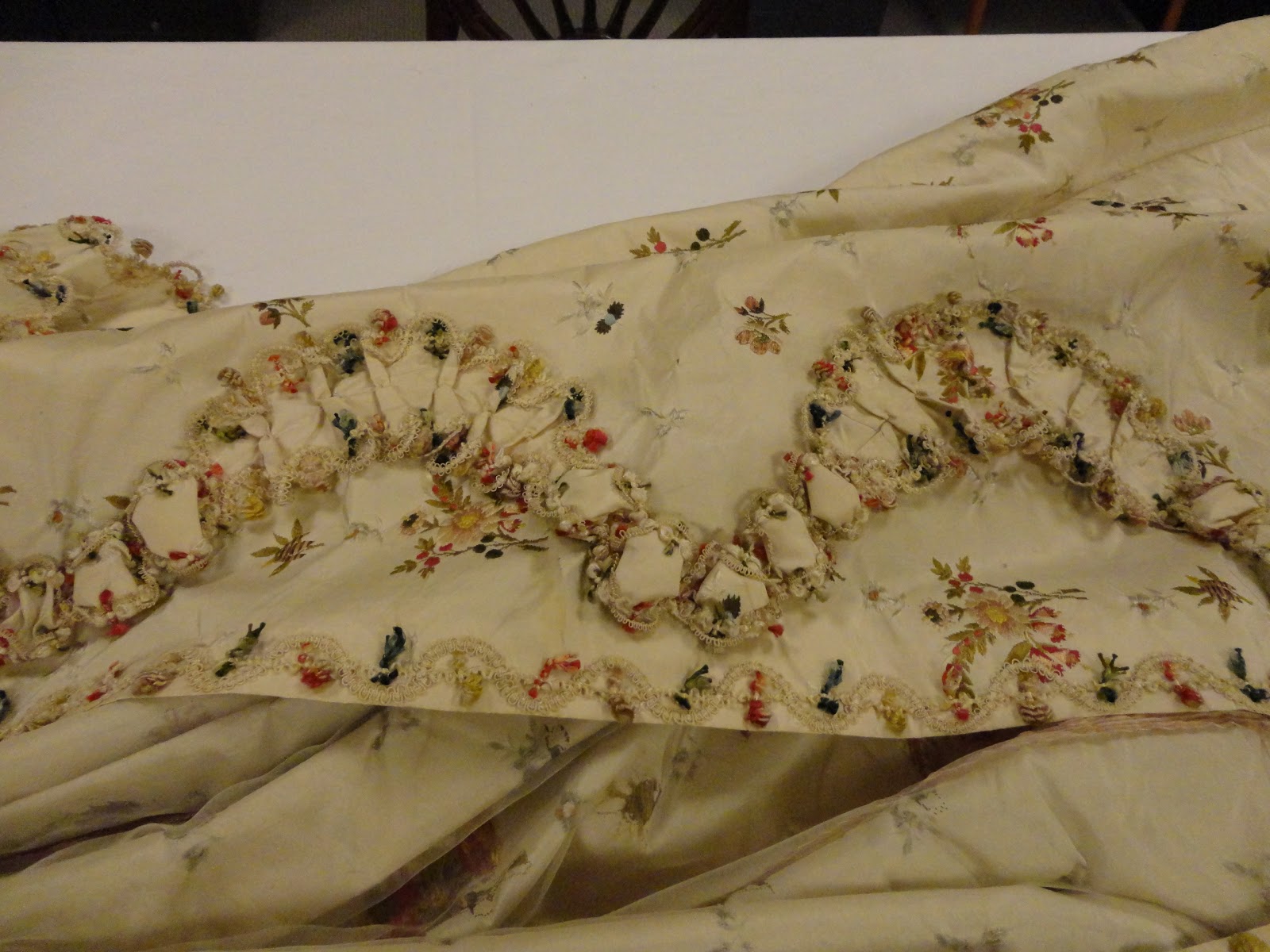 Great, Strange, and Rarely Seen is an exhibition being put on by the Albany Institute of History and Art – it encompasses a huge variety of artifacts, but I'm working on the ones related to fashion (combs, fans, dresses, hair jewelry, etc.). I brought up the idea of publishing Janet Arnold-esque patterns of all the dresses in it in a pamphlet to sell in the gift shop, but due to time and money constraints it was decided that it'd be better to put pictures of the dresses on the museum's website along with downloadable PDFs of the patterns. So everyone will be able to have them! And part of my selection process was based on whether or not the patterns would be duplicates of those in Arnold or Waugh.I would really, really love to make a copy for reenactment in the future, though! I normally don't like fly fringe or that amount of decoration, but the bows on the petticoat hooked me.