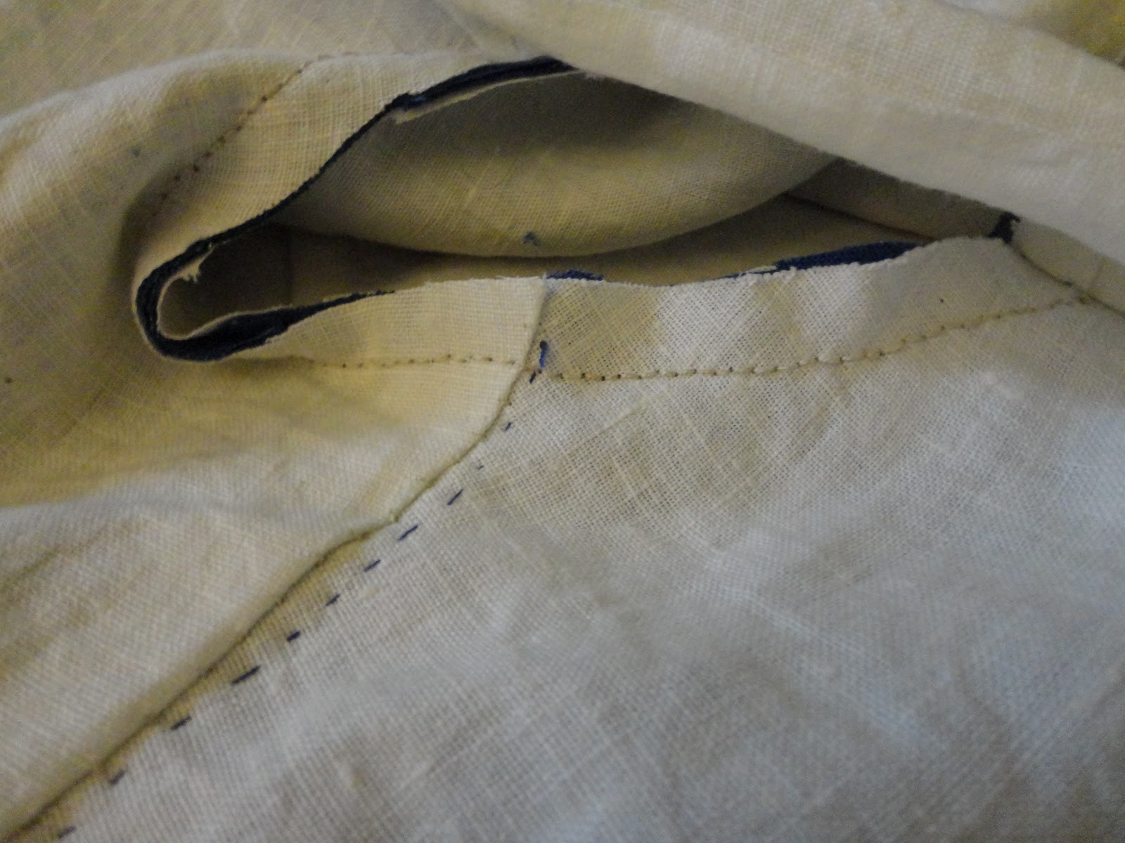 The shot I took of the other armscye showed a really crooked seam, but I think this one is rather nice. I can do small, even backstitches when I put my mind to it. For a quick rundown: the blue linen is fabrics-store’s True Blue, 5.3 oz; the lining is their bleached white, 4.3 oz; and the threads are William Booth, Draper’s 35/2 unbleached and 50/2 royal blue linen thread. (The sleeve lining is actually fabrics-store’s bleached linen/cotton blend, 4.3 oz. I bought lots of it ages ago for my Tudor outfit, and it comes in handy when I run out as I did here.)
