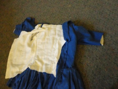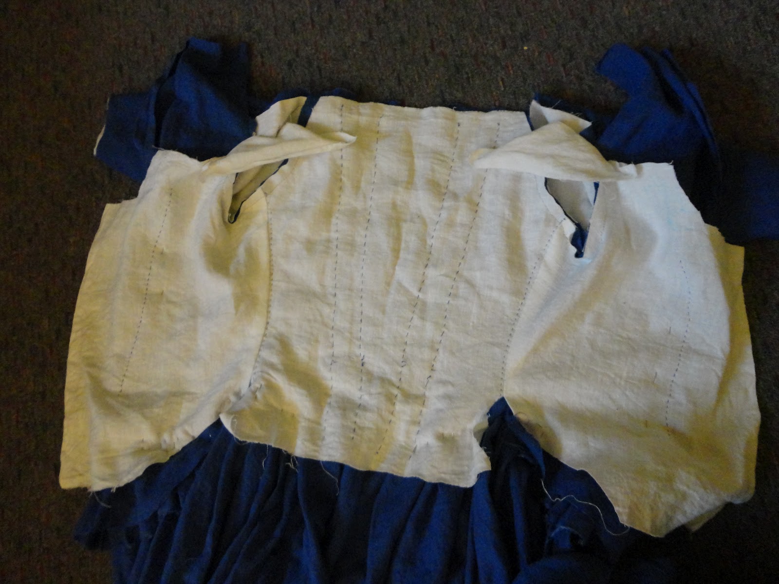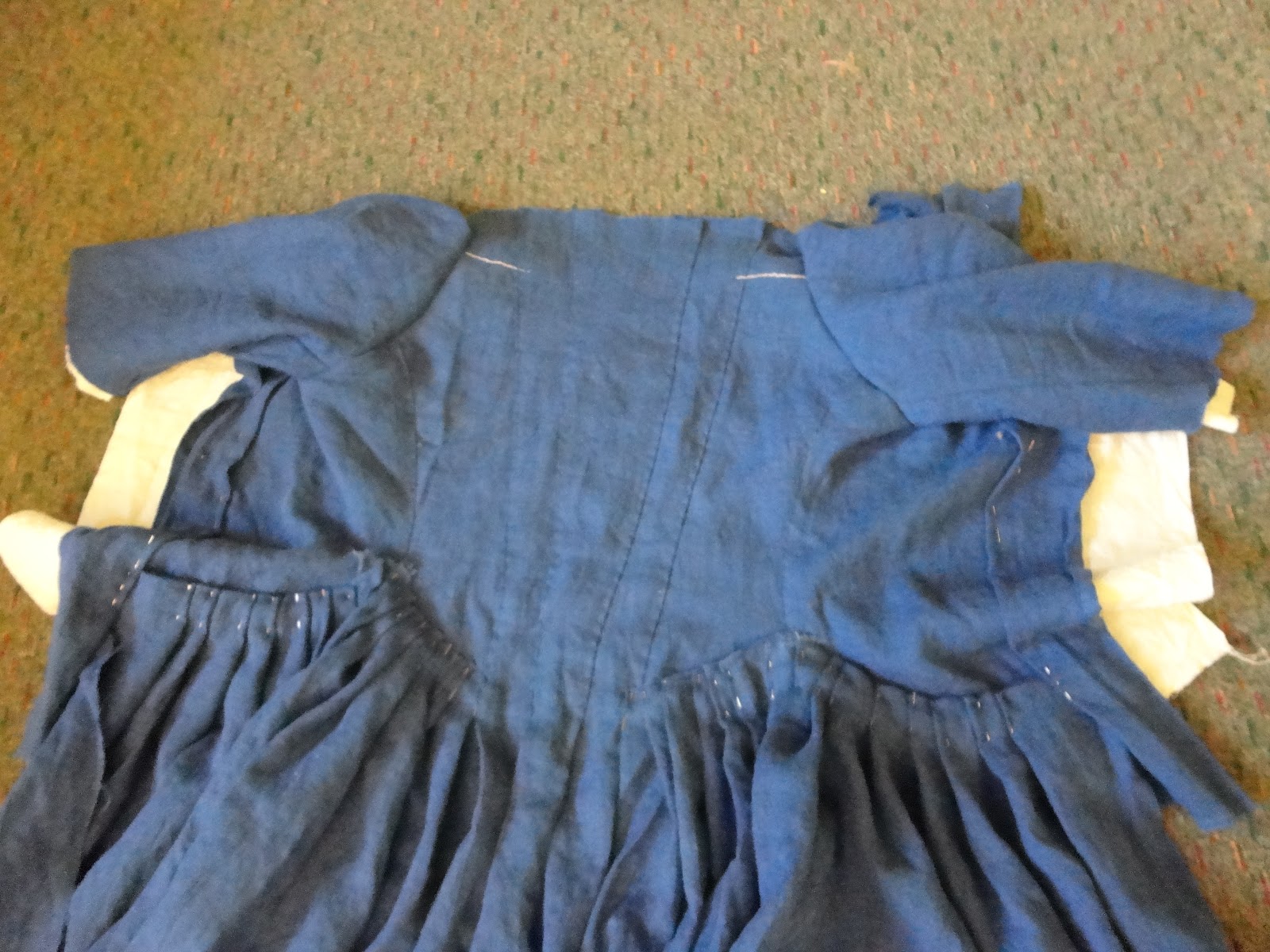 Today, I sewed the lower part of the armscye, but did not get around to pleating the top of the sleeve. Here you can see that I messed up a bit when pleating as I forgot to include a CB reverse box pleat. Next time! The skirt pleats (done by my wonderful mother) are just pinned to the outside, but I’m going to sandwich them between the lining and blue linen once I have the shoulders finished.