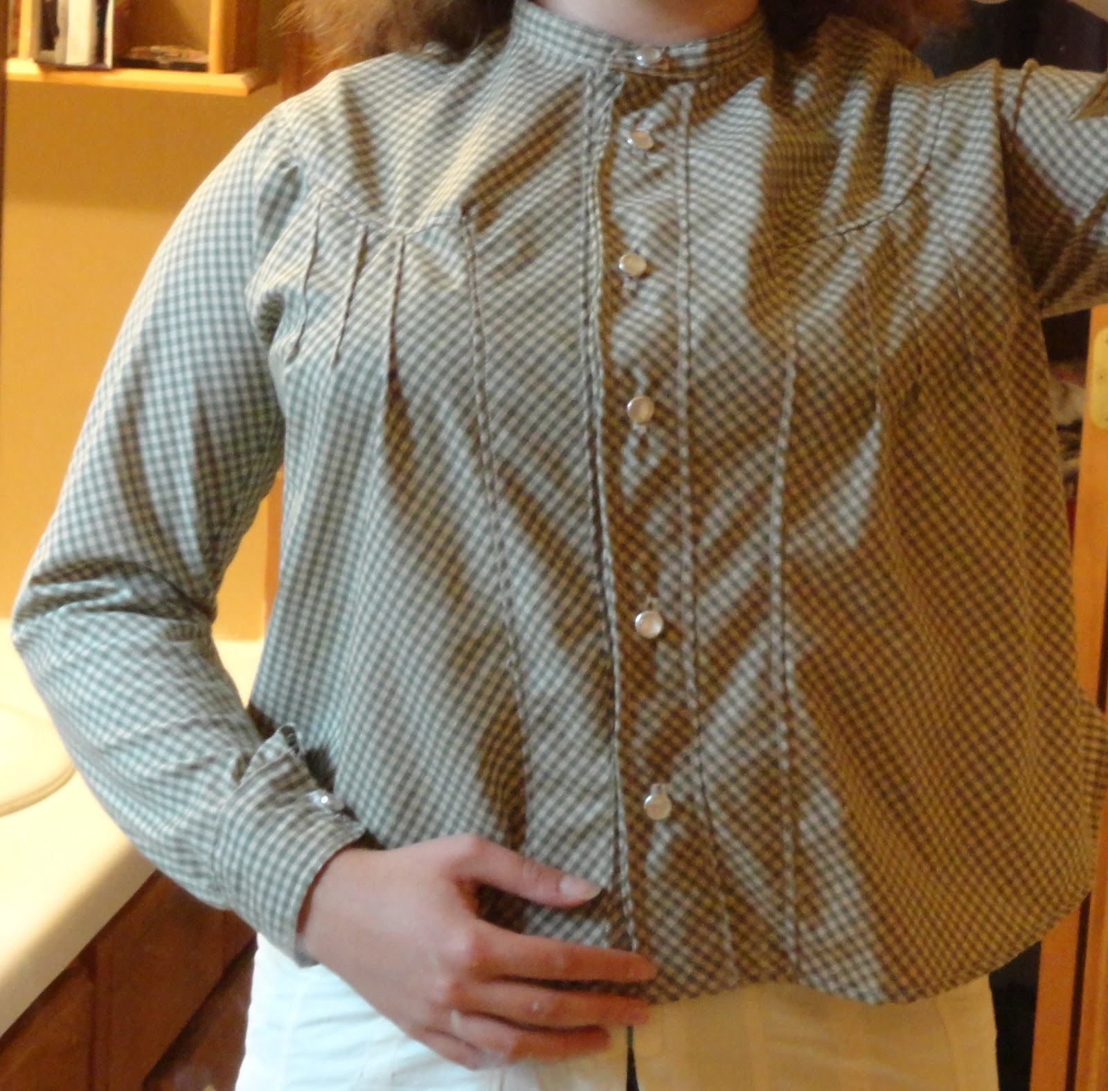This is my second garment for the VPLL 1912 Project, and my first done in normal scale and without any instructions. For fabric, I used a large piece of $2/yd green checked cotton I’d bought for making a muslin a while back, which happened to match up with what the pattern recommended. The reasons I picked this pattern are that I want to be more comfortable with blouse sewing, I’d like a 1912 blouse, and I find the emphasis on the shoulders which was very common from about 1906 on, which is present in the blouse, to be very interesting.