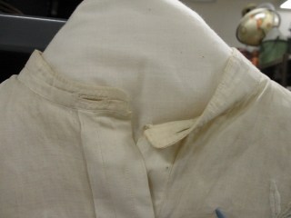 You can see that the shirt has a narrow band collar with buttonholes, so that shirt studs could be used to hold on the collar; the cuffs are also meant to be worn with cufflinks.