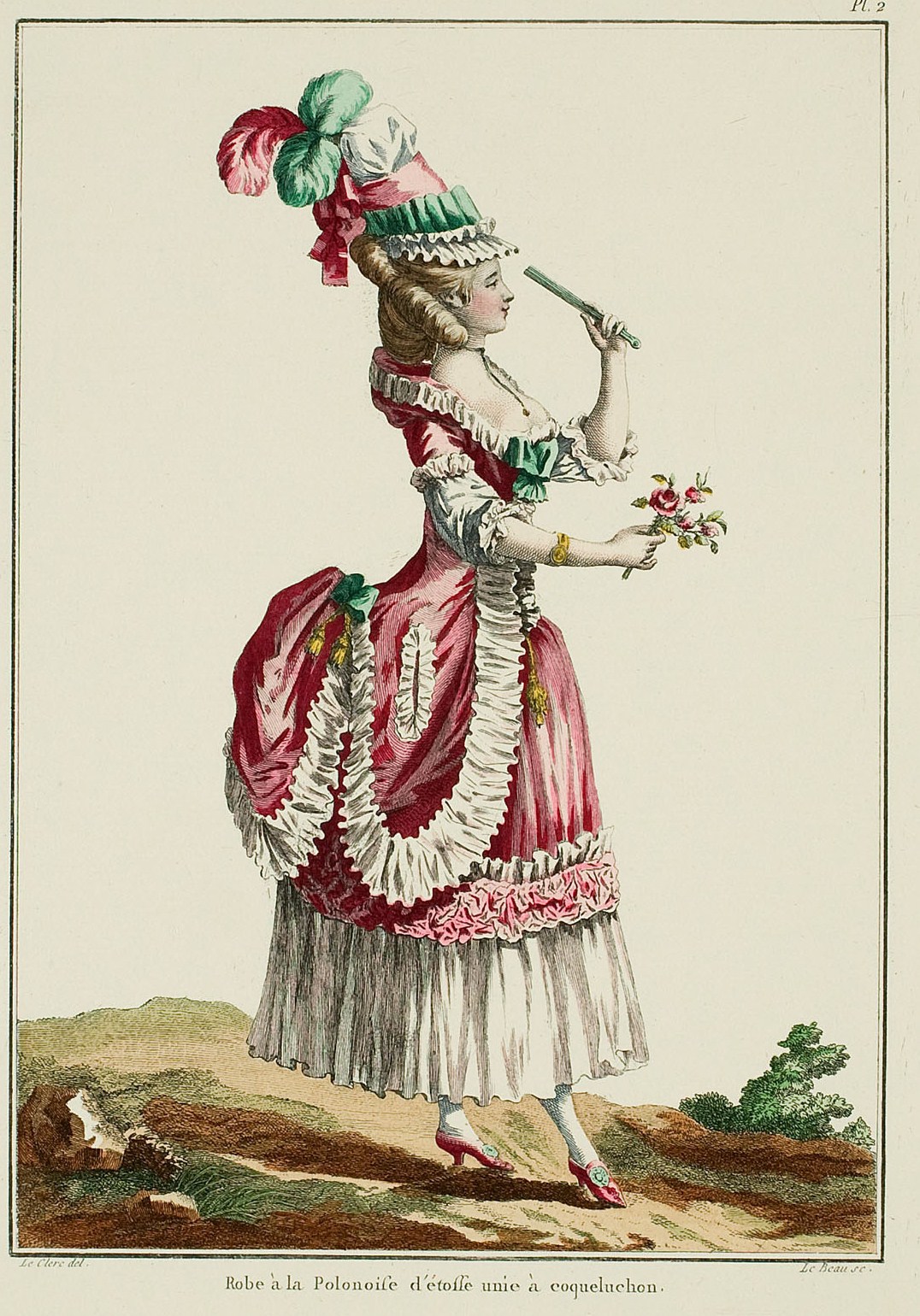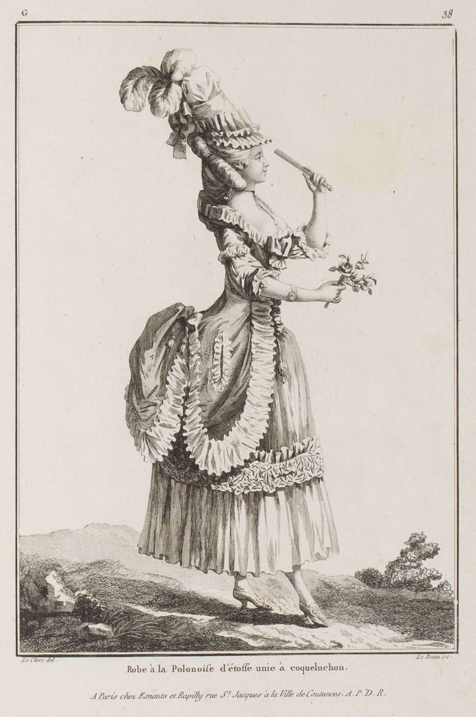 ** There is a stomacher or waistcoat worn under the polonaise, not visible in the plate.
