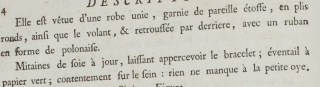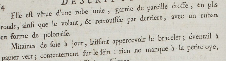 She is dressed in a robe unie,* trimmed with the same material in box pleats, as is the volant, and pulled up in the back with a ribbon in the manner of a polonaise.**