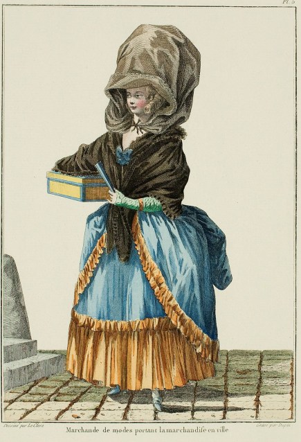 Drawing of a character, representing the marchande de mode, who carries her merchandise in the city.