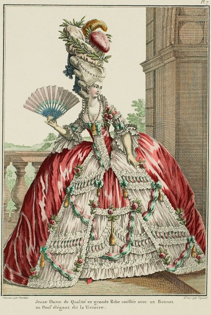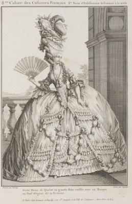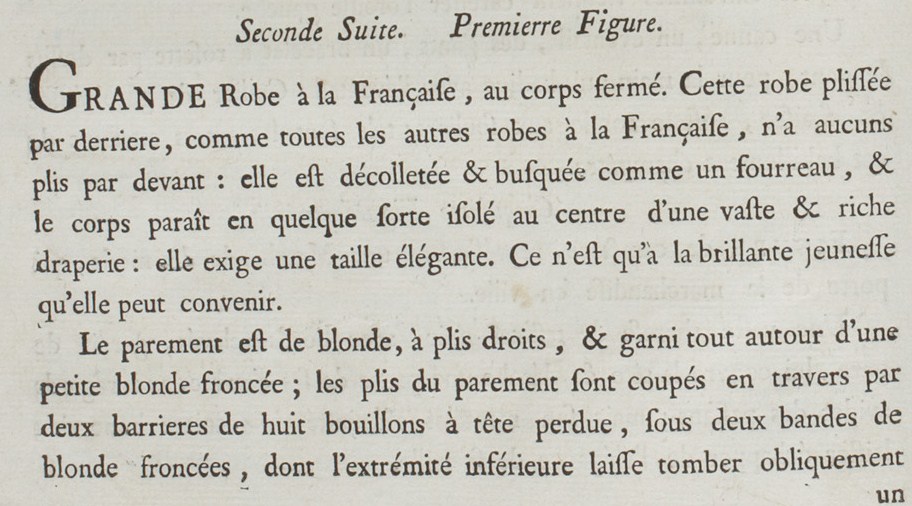 *** For more on the robe parée, see my post here. These were worn for evening entertainments at court and eventually became the official presentation costume. It is here described as the “plus grande robe” because the robe de cour was seen as a different animal, not made along the lines of ordinary formal dress.