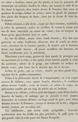 “Victory” cap; this is a very elegant pouf, girded with a double laurel branch, and shaded by a panache of three ostrich plumes in various colors: a large gauze bow with two gathered and hanging ends is on the back of the head; bulging chignon, supported by a solid-colored ribbon.