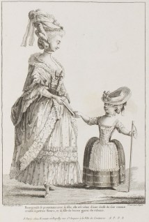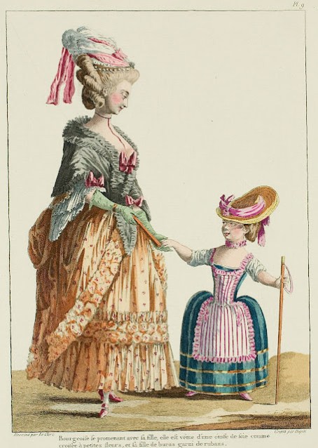 Bourgeoise walking with her daughter; she is wearing an informal gown and petticoat of the same material, pulled up at the sides with cord or gold braid.* Trimming in two rows of poufs; volant very high, in regular pleats, with a band of double poufs at the top like the trim of the gown.