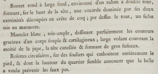 Round cap with a large back, wrapped twice with a ribbon, forming a cockade on the top of the head below its two ends, pinked like a cock’s comb; over the whole, a “sleepyhead” kerchief.**