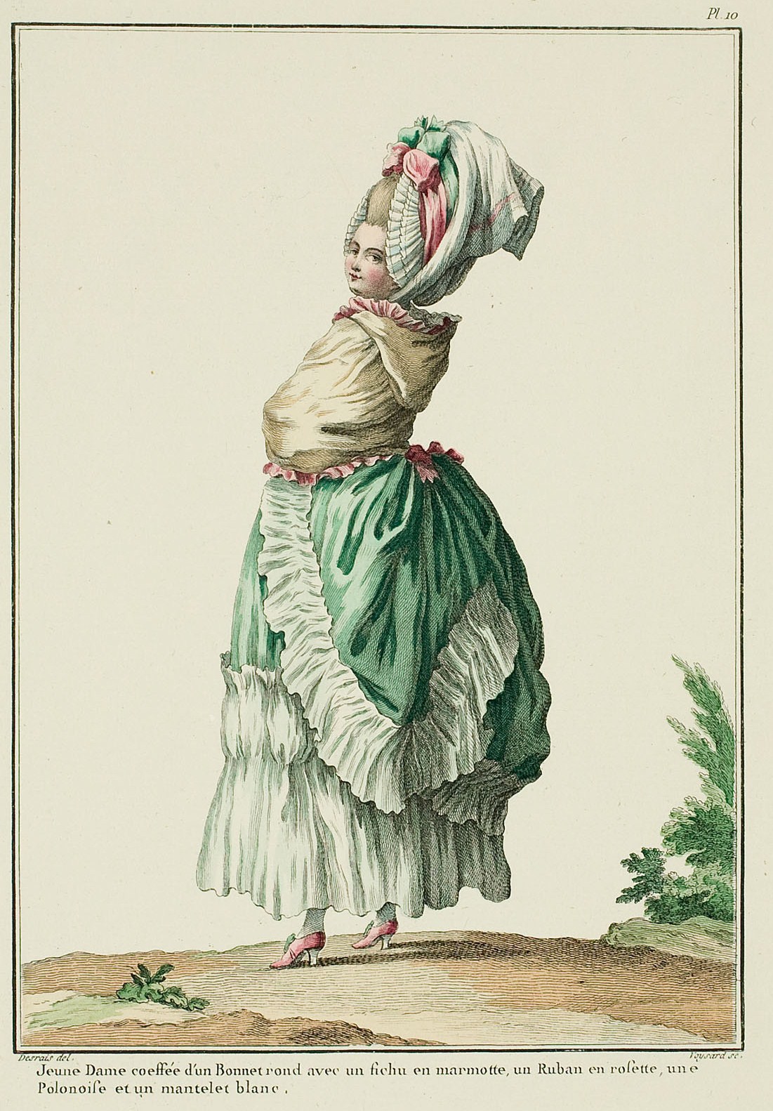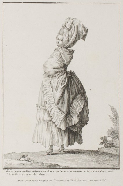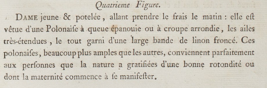 Plump and young lady taking the fresh air in the morning: she is dressed in a “flourishing tail” or “rounded rump” Polonaise* with very expansive wings, the whole trimmed with wide bands of gathered linen. These polonaises, much more ample than the others, perfectly suit people whom nature has given a nice roundness or whose pregnancy will soon show.