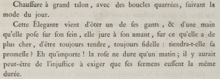 This Elegant Lady has removed one of her gloves and positioned one hand on her chest. She swears to her love on that which is most dear to her to be always tender, always faithful: will she keep her promise? Oh, what does it matter! The rose lasts only a morning; it would perhaps be unjust to demand that her oath have the same duration.