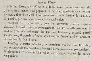 Black taffeta mantelet, with the ends of the hood coming to be lost under the contentement; these are called mantelets à coulisses; they are now the only kind in fashion, except among the devout ladies and certain ladies who are obliged by their age or other reasons to cover their chests.