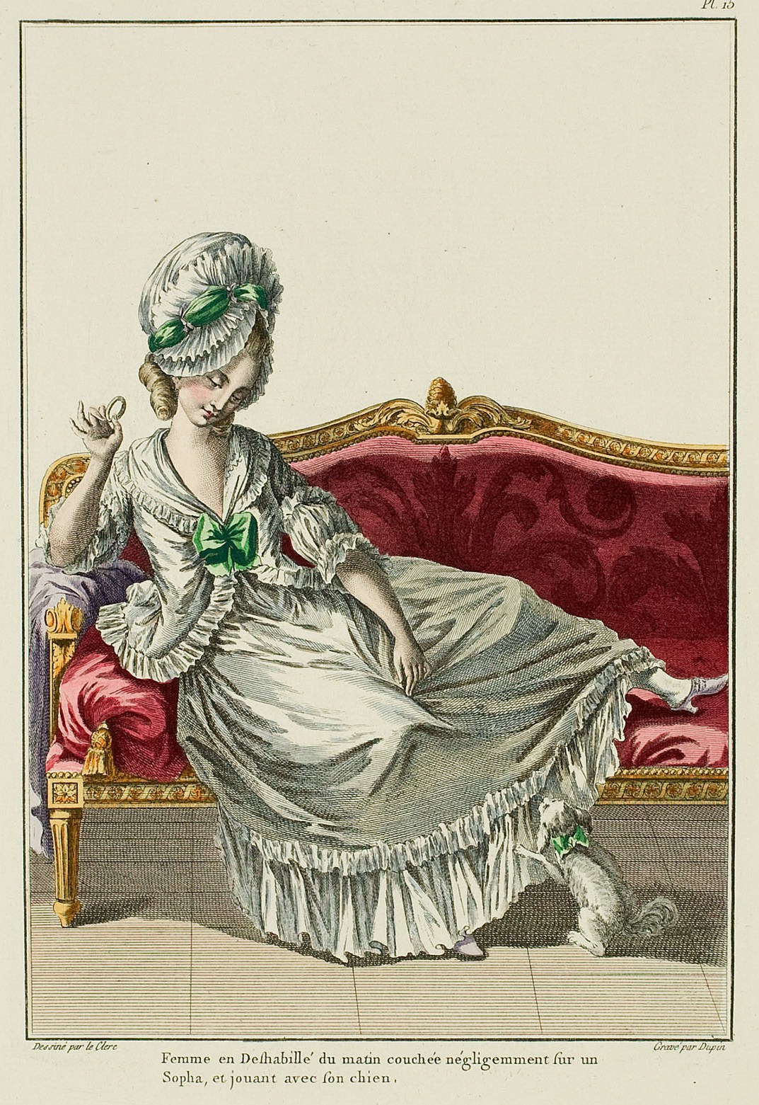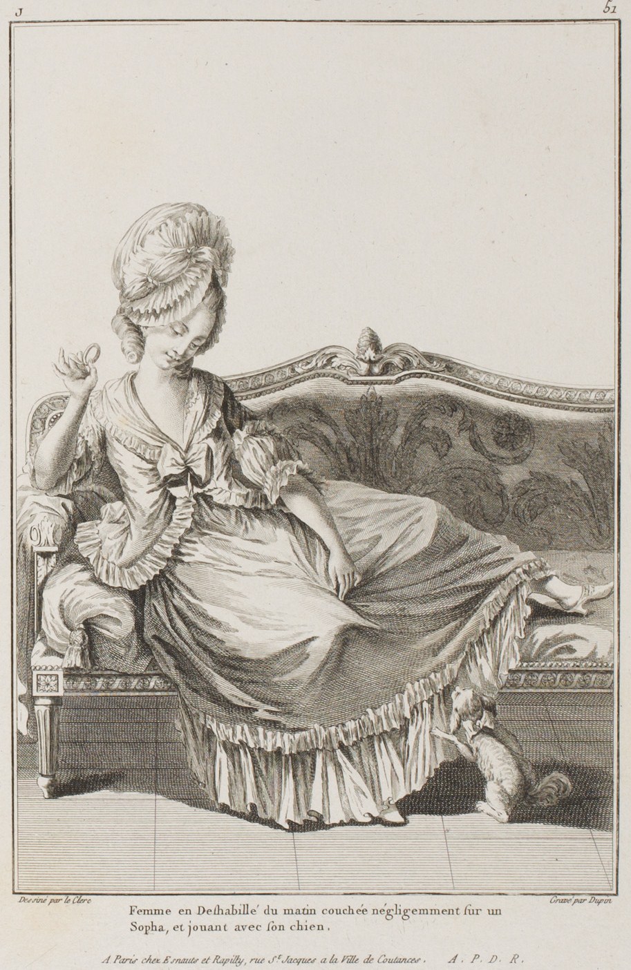 This beauty, half-stretched on the sofa, waits for the moment of her toilette or a romantic meeting; she plays with her dog: the little animal, no less dainty than it is submissive, performs diverse tricks to satisfy his mistress and get a giblet that she is holding. Already she has had fun attaching a pink collar made of bouilloné ribbons; maybe it has received its first kiss: it is almost always assured of a preference.