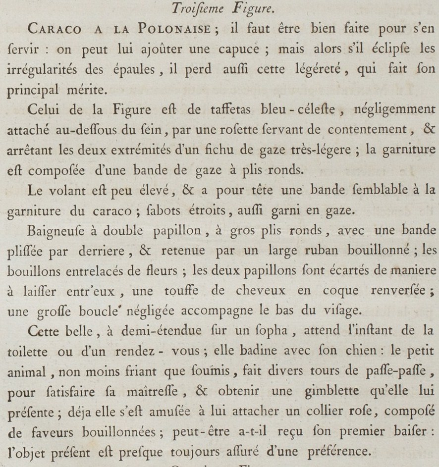 The one in this Drawing is of sky-blue taffeta, negligently held in front of the chest with a bow that serves as the contentement, and also holds the two ends of a kerchief of very light gauze. The trimming is composed of a band of gauze in box pleats.