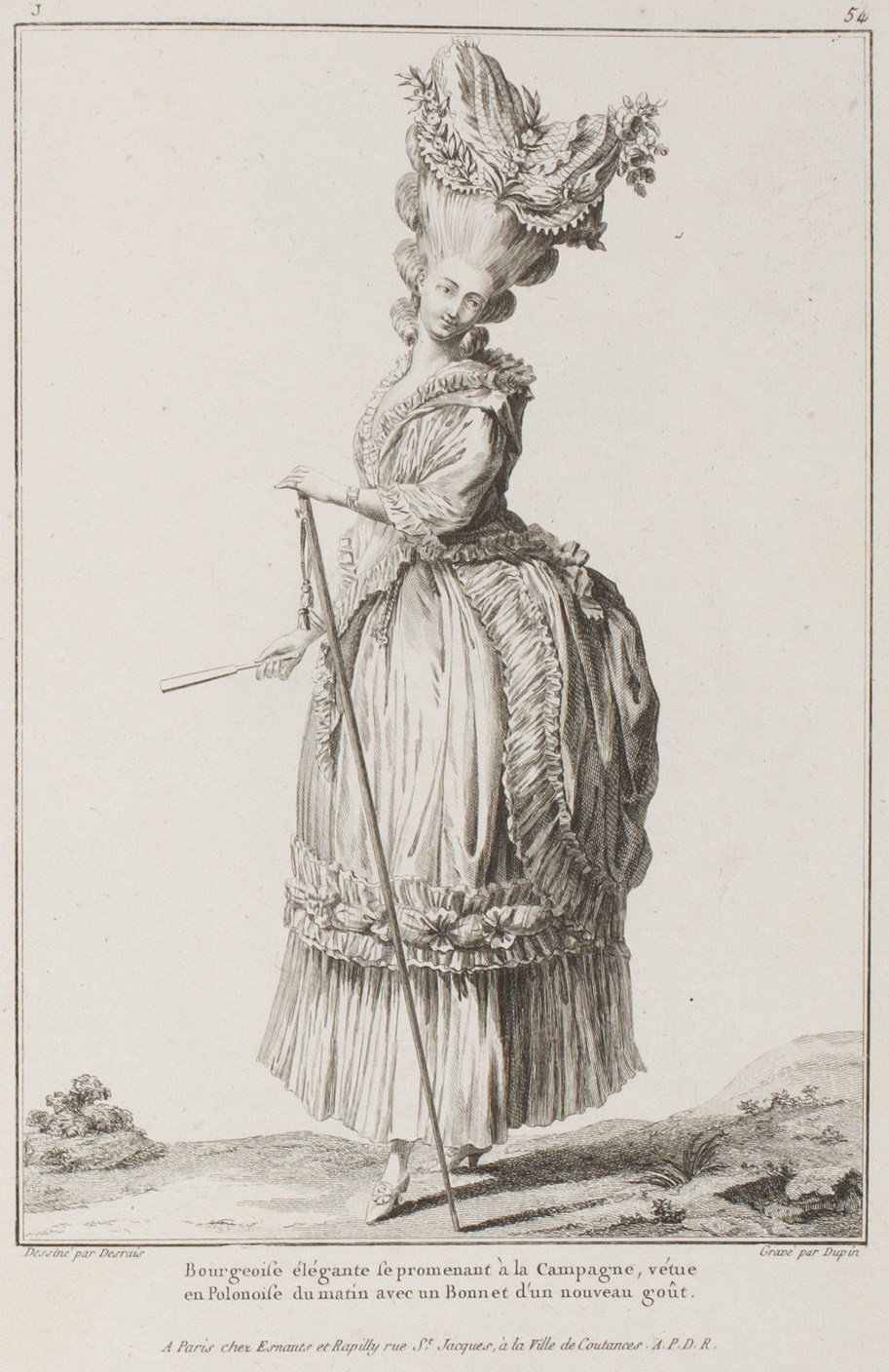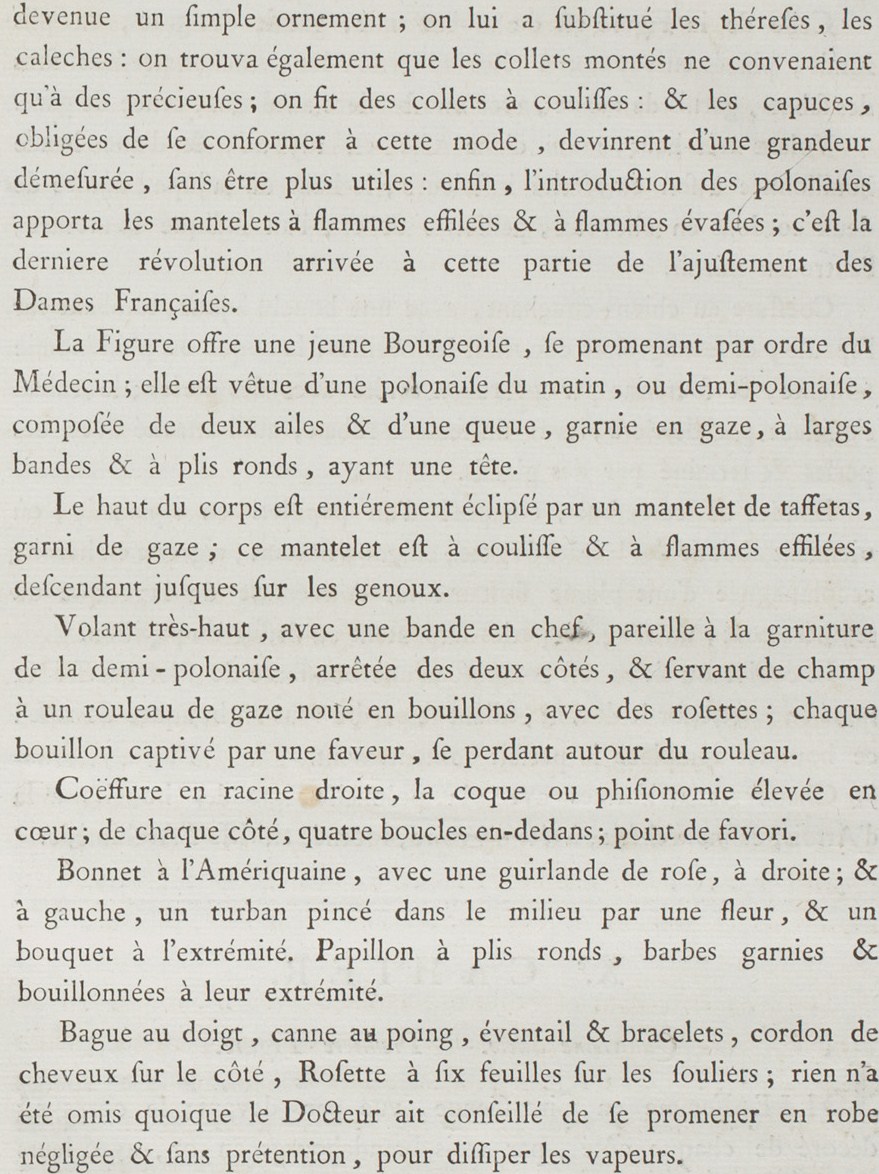 The Print shows a young bourgeoise, walking on her Doctor’s orders; she is dressed in a morning polonaise, or demi-polonaise, composed of two wings and a tail, trimmed with gauze in large bands and box pleats, having a heading trim.