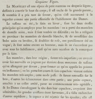 Taffeta in summer and satin in winter are the two main materials that are employed in mantelets: black lace mantelets are worn, but they are fallen into discredit and have been relegated to the provinces. Mantelets of white lace, and of solid or embroidered Indian muslin, and lined with pink, have likewise been in vogue; they are still in style, but they do not go with all outfits, so they will be remarked on later.