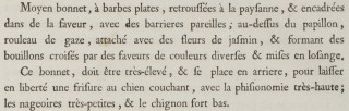 Medium cap with flat lappets, pulled up peasant-style and framed with ribbon with matching barriers; over the papillon a roll of gauze, attached with jasmine flowers and forming bouillons crossed with diversely-colored ribbons and placed in lozenges.