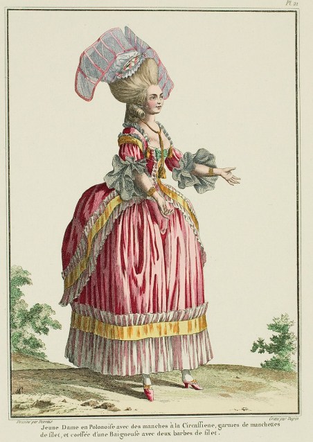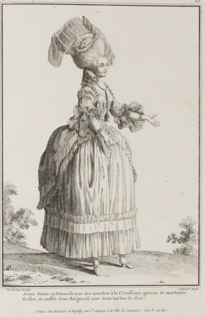 Naturalists, with their experience, teach us that the mixture of different species only produces monsters: it is not the same in the kingdom of costume, the empire of Fashion. The alliances between clothes of different genres, of diverse types, often create very agreeable results: it is that which has happened to the mixture one is advised to make between the polonaise and the circassienne; it has resulted in a very graceful gown, which can be seen in this print.