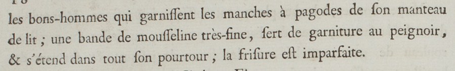 She is in a peignoir with large, open sleeves, allowing the sight of the bonshommes that trim the sleeves à pagode of her bedjacket; a band of very fine muslin serves as the peignoir’s trim, and extends around its circumference. The hair is not dressed.