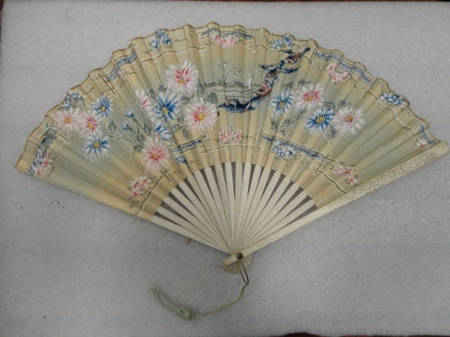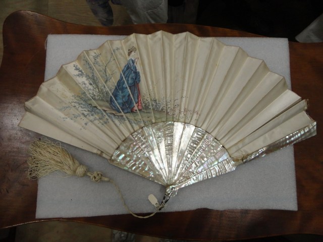 An 1880s fan with mother-of-pearl sticks and a heavy silk leaf, printed with an eighteenth century woman in a sacque. Lovely silk tassel.