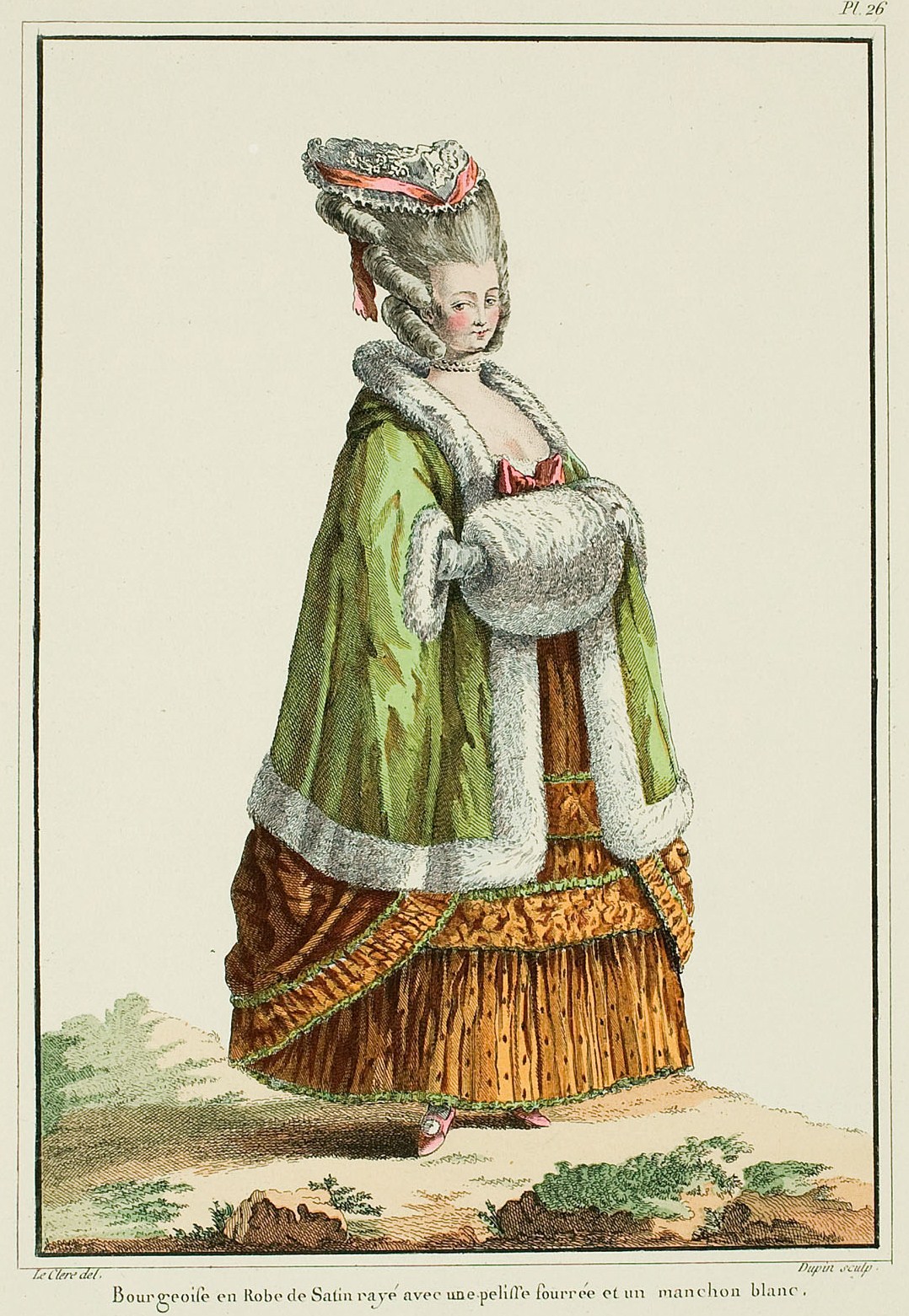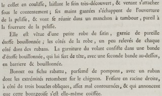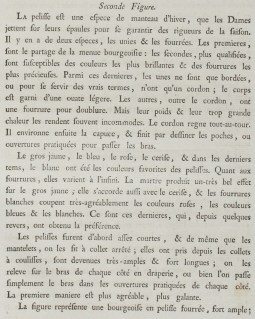 The pelisse is a type of winter overcoat that Ladies throw on their shoulders to protect themselves against the rigors of the season. There are two types, the plain and the furred. The former are worn by the unimportant middle class; the latter, of higher quality, are likely to be in the most brilliant colors and the most precious furs. Among them, there are ones that are only bordered, or to use the true terms, only have a “cord”; the body is lined with a light cotton. The others, without the cord, have a fur lining, but their weight and heat often render them uncomfortable. The cord covers it all around the edges. It surrounds the hood and finishes by outlining the pockets, or openings used to pass the arm through.